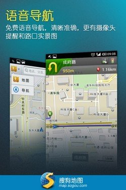 搜狗地图作为业内首家推出免费语音导航的地图服务商,在安卓3.0版中,持续优化语音导航方面的体验,可以提供精确到大门口的全程语音导航服务,而且还有逼真的路口实景图和摄像头提醒,再也不必担心导航数据长期未及时更新,而被带到海里去的窘况。