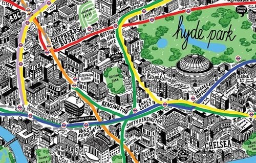 英国插画艺术家Jenni Sparks绘制的手绘风格地图让人看了爱不释手,伦敦的每一条街道、建筑名胜、商场和本地人钟爱的酒吧都有明确的指示和标注,这样一个浩大的工程中每一个细节Jenni都没有懈怠,充满趣味性的感觉难怪人见人爱。