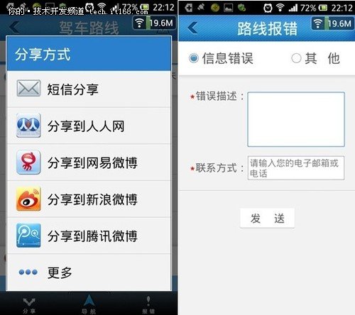 仔细观察上图的右下角部分,有个“报错”功能,可以将你看到的错误路线信息直接上报给图吧。另外,分享更加智能,汇集了国内领先的社交元素,让你的分享更加快捷。