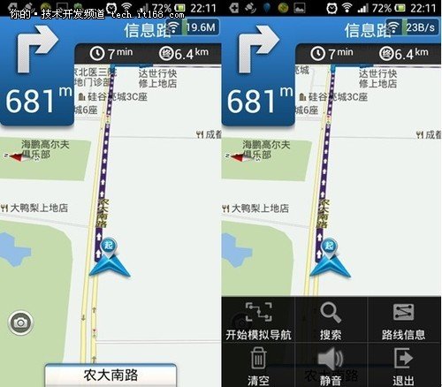 进入导航页面,语音导航开启,播报非常清晰。你也可以静音,同时可以开启模拟导航,模拟选择的路线。