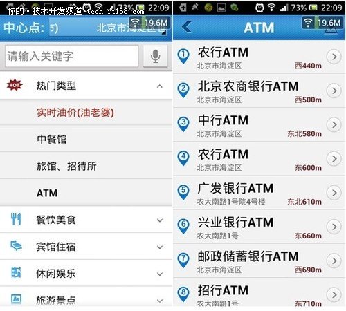 点击“周边”,你会清楚的看到周边所有的服务信息,比如选择其中的ATM,附近所有的ATM都会显示出来。数据非常的准确,操作非常的简单。其实这正是移动互联网带来的魅力,让我们随时随地享受各种生活服务,科技正在无处不在的改变我们的生活。
