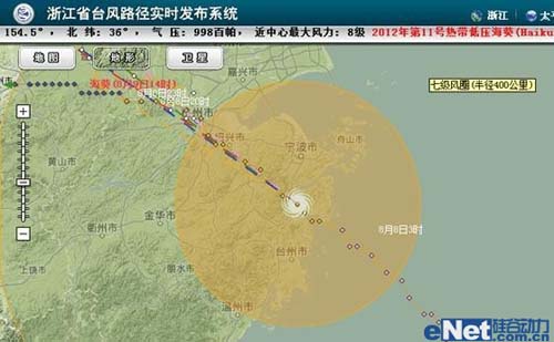 作为深受台风困扰的东部沿海省份,台风一直是浙江省防灾的重点工作之一。浙江省水利厅为此研发了浙江省台风路径实时发布系统。该系统的主要数据均来自国际、国内权威发布机构,通过先进的地理信息系统,进行合理科学的计算,对台风的历史轨迹以及将要运动到的轨迹直观地展示在地图上,给公众获取台风信息的窗口。