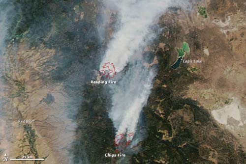 在利福尼亚州北部,三起大型野火烧毁了大片针叶林:拉森火山国家公园的雷丁大火(Reading fire),普卢默斯国家森林的奇普斯大火(Chips fire),克拉马斯国家森林的康姆普莱克斯堡大火(Fort Complex),其中最大的是奇普斯大火。