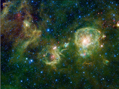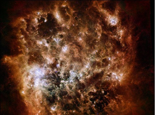 图3 大麦哲伦云图中显示在红外波长下灰尘向外释放热量,临近的星系也如此。这是邻近银河系的大麦哲伦星云的红外图像,显示了不同温度的灰尘正渗透所有区域。