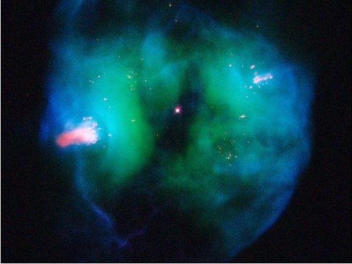 图2 红巨星形成恒星的灰尘被认为起源于其它恒星的死亡。肿胀、衰老的红巨星最终将失去它们的外层,留下一个超级炽热的发光内核,正如图中所示NGC 2371星云的中心区域,该星云距离银河系4400光年,红巨星气体中的灰尘将像烟囱中的烟一样外流。
