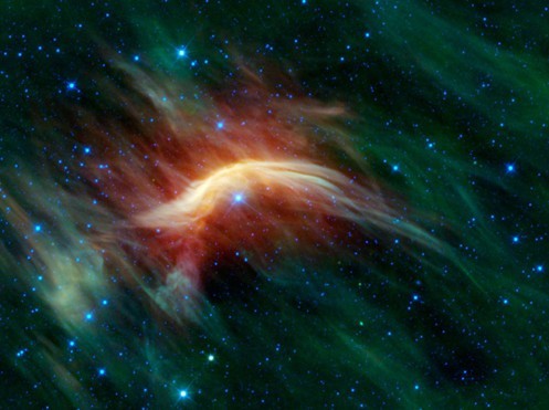 图4 灰尘途径当距离我们星系360光年遥远的超大质量恒星泽塔蛇夫座穿过银河系时,红外图片显示一个“弓激波”灰尘结构正在形成。
