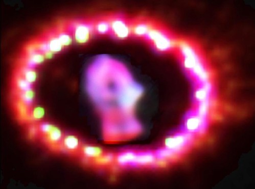 图5 SN 1987A 超新星1987A位于大麦哲伦星云,这颗最大的超新星在现代就已经逐渐消失。超新星爆炸的力量能够将周围环绕的灰尘颗粒爆炸粉碎成最初的原子结构,目前令人费解的测量发现,超新星所含灰尘足以构成20万颗地球。