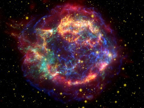 图6 仙后座A 这样庞大的灰尘数量意味着,超新星而非红巨星,可能才是产生银河系及邻近区域所观测到的大量灰尘的主要源头。然而其它超新星,诸如这里的仙后座A,目前存在的灰尘数还较少。该超新星300年前我们星系爆炸的残余物。