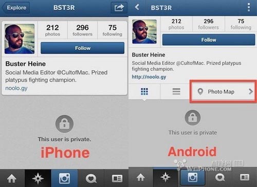 以下是Instagram 3.0中iPhone和安卓的“私人用户”界面。