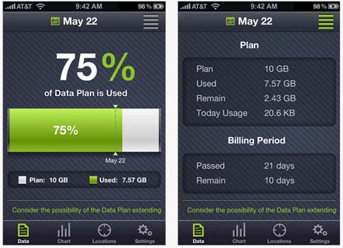 当我们第一次启动4Glob的时候,4Glob会让我们输入手机流量套餐,以及当月的使用情况。软件会定期检查数据流量的使用,然后以多种形式展现出来,为的就是让你全方位的了解自己的使用习惯。首先是普通的统计:包括你已经用了本月流量的百分之多少和具体数值,细节还包括剩余流量,当前使用的流量,以及用了多少天和还剩多少天。其次的图标方式,则可以让你一目了然的看到流量使用幅度,在哪几天使用量更多一些。