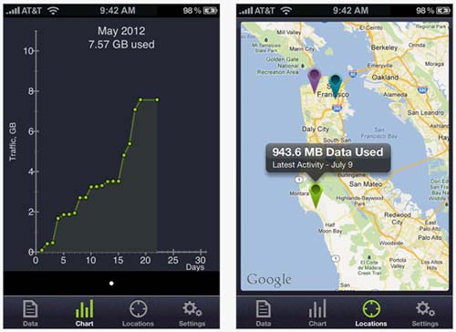 最有意思的是地理位置的展现,现在基于地理位置的功能到处在软件中出现,但没想到流量统计软件也运用起来。4Glob会以坐标的形式标注我们使用数据流量的地理位置,然后在每个坐标上都可以查看到有多少流量在这个地方被使用,以及最后一次使用的日期。很有趣,不是吗!