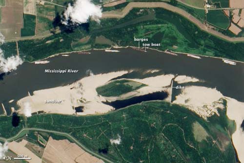 2012年8月,随着美国大部分地区旱情的持续,密西西比河中部和南部有些河段的水位接近历史最低水位。8月20日,一条拖船及其驳船搁浅在密西西比河主河道中。