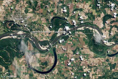 据美国陆军工程兵团维克斯堡办公室工作人员史蒂夫·琼斯报告,这次轮船搁浅事故发生在美国82号公路跨密西西比河大桥以南约10公里的地方。轮船搁浅导致该河交通中断,有近100艘船舶滞留。