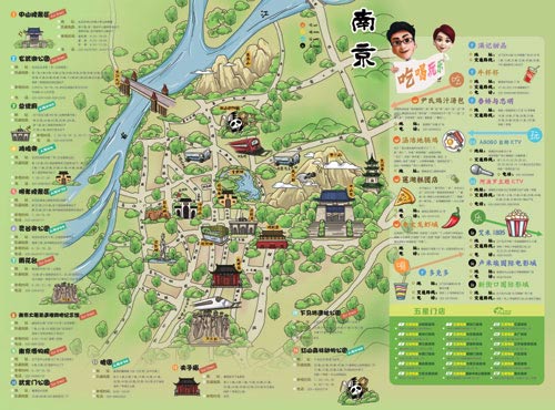 该地图不仅具备传统地图的功能,更以卡通的形式重点描绘出了南京的包括中山陵、夫子庙、玄武湖公园、总统府、鸡鸣寺、南京博物院等主要景点,并详细标注了景点名称、地址、交通线路共和参观时间等,方便学生出游。同时,在地图上学子们还能找到既有名气又平价的吃喝玩乐信息,如尹氏鸡汁汤包、莲湖糕团店、朱大龙虾城、AGOGO自助KTV、卢米埃国际电影城等,以及五星电器的门店地址,能够帮助新生一目了然了解和融入南京这座历史文化名城。