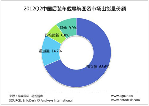 易观国际:据EnfoDesk易观智库产业数据库近期发布的《2012年第2季度中国后装车载导航市场季度监测报告》研究显示:凯立德、道道通、四维图新分别以68.6%、14.7%及6.8%的比例占据当季中国后装车载导航市场正版图资出货量市场份额前三名。