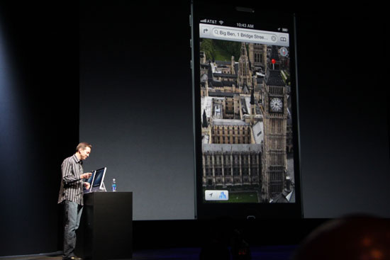 由于在此前的WWDC大会上已经介绍过iOS 6,因此这次发布会对iOS 6的介绍也仅是补充与回顾。我们最关注的莫过于苹果自家的地图服务。苹果自主研发的地图服务采用全新的用户界面设计,并配有与iOS系统颜色统一的导航栏。苹果介绍说,地图目前已经有1亿个POI信息,支持3D模式(Flyover,低空飞行),并且地图中所有建筑、物体、树木甚至路标都被三维化,达到了360度完全可视的三维效果。此外,地图中还加入了导航功能,会自动提示目前的交通流量情况,可以使用户避开拥堵路段。