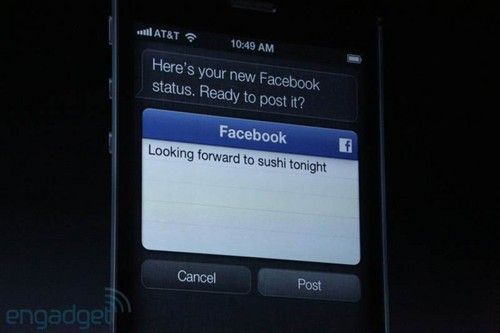最后Siri也照样和Facebook和Twitter结合,当用户在通知中心里面语音输入状态是,Siri会自动识别用户输入的信息并且转换成文字,用户可以轻松的最心爱通知中心里更换状态。