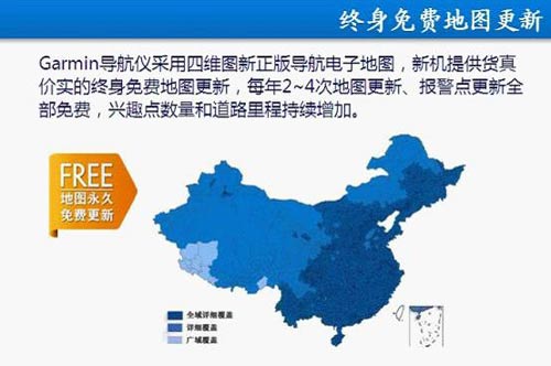 在导航方面,两大系列新品均预装了最新的四维图新正版导航地图,支持地图升级终身免费服务。新版地图信息更加齐全、指引更加清晰、路径规划更加合理、兴趣点更加丰富;导航道路里程全国最长、3D实景图业内最多;具有丰富的二维地标建筑物,还具有公交车点导航、海量路口门牌搜索查询、一键导航回家/回公司、超复杂路口鸟瞰图、高速公路预报、分时段限行自动回避、自定义回避区域(道路)、动态车道转向提示、高架平面道路切换、主动式停车场显示、记录上一个停车位、日夜模式自动切换、品牌图标醒目显示、大型区域多重出入口关联查询等业内独有的导航附加功能,承袭了Garmin(佳明)导航仪的专业性。