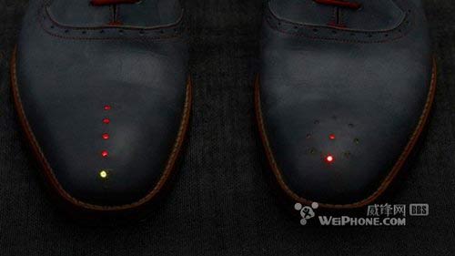 这双鞋上装有LED灯作为指示作用,其中左脚鞋子上的LED灯呈直线排列,用于告诉你还有多远路程才到家。右脚鞋子上的灯为圆形,用来指示方位。