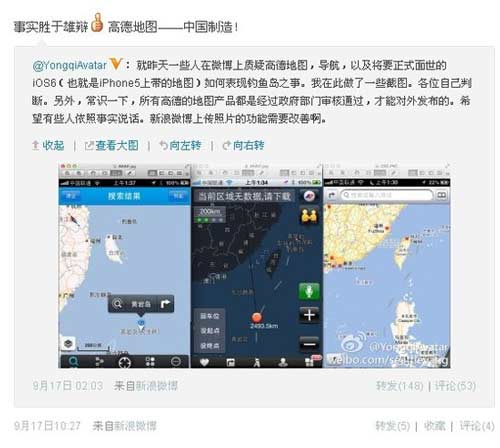 就在很多人质疑高德地图的时候,高德集团副总裁杨永琦在微博上发表了正面回应。杨永琦称高德地图、导航以及即将问世的iOS 6地图中,钓鱼岛都属于中国领土,他还表示所有高德地图产品都是经过政府部门审核过,才能对外发布。也就是说不存在iPhone 5将钓鱼岛划分给日本这一说法。