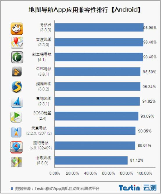 其中导航犬表现最好,适配率达98.99%,整体上来说能够保证在大部分手机上正常使用。而定位精准的谷歌地图软件在这方面稍显逊色,近两成安卓用户无缘体验谷歌地图。