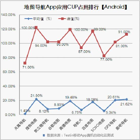 从CPU消耗来看,所有参加测试的10家App平均水平为13.21%。 其中天翼导航能耗最省,凯立德、导航犬、SOSO地图等表现也较为突出,搜狗地图以21.90%的占比排名垫底。
