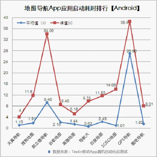 从启动性能来看,所有参加测试的10家导航类App应用平均水平为4.87秒。导航犬以0.62秒夺冠,高德、图吧、天翼导航等表现同样不俗,GPS导航以26.96秒垫底。