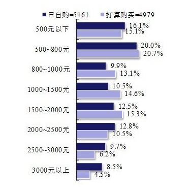 超过800元以上中高端价位GPS的选择上,已经购买和将来打算购买的被访者差异拉大,在800~2000元价格区间,将来打算购买该价位GPS的比例大于已购者,而选择价格在2000元以上的则以已购者居多。