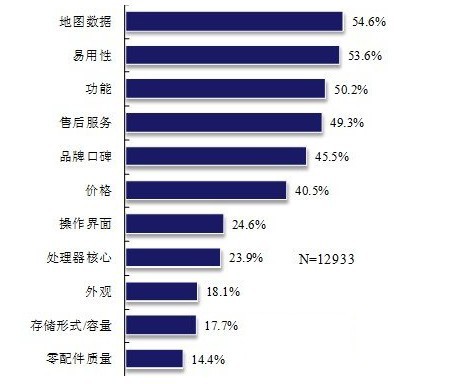 GPS由于集多种功能于一身,所以消费者在购买GPS时的看重因素也呈现多样性,“地图数据”、“易用性(如安装和使用都很容易)”、“功能”、“售后服务(如地图升级)”、“品牌口碑”、“价格”等都受到广泛关注。