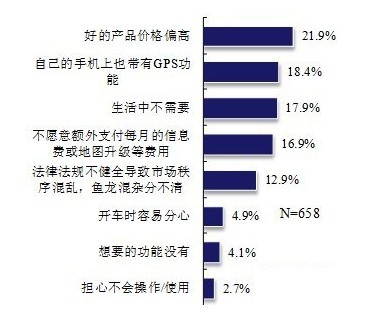 在拥有车辆但却不打算购买车载GPS的被访者中,多种原因导致他们对GPS不感兴趣,主要原因有:“好的产品价格偏高”、“自己的手机上也带有GPS功能”、“生活中不需要”、“不愿意额外支付每月的信息费或地图升级等费用”等。