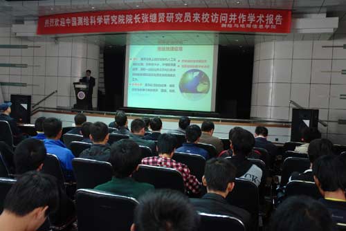 作为庆典活动内容之一,中国测绘科学研究院院长张继贤在揭牌仪式结束后在学校萃英厅作了题为《地理国情监测》的学术报告,对我国地理国情监测的动态和静态情况作了系统科学的分析,强调了国家领导对测绘行业的关注与要求。同时,他希望将这一学科形成产业,并以此来推动就业。有300余名师生听取了报告。
