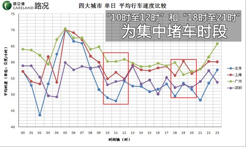出行速度方面,北京不愧为中国“首堵”!而深圳、上海、广州依次列二、三、四位。除了凌晨4-5点速度超过70之外,其余时间的平均时速大约在55KM/H左右。而常常自诩路窄车多的广州,倒是一路畅通,平均时速超过60KM/H。