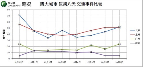 尽管京津冀地区的总体交通事件数量要少于长三角和珠三角,但单以城市交通事件而论,北京以近400起交通事件继续蝉联“堵城”冠军。上海、广州则紧随其后,分获银牌和铜牌。值得注意的是,虽然几条出入北京的高速公路,比如G2京沪高速和G6京藏高速虽然都是此次国庆长假著名堵点,但并未发生特别“暴堵”现象,值得表扬。