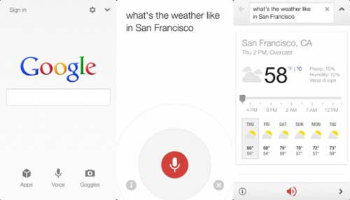 谷歌在改善其苹果iOS系统的语音搜索上做出了自己的努力。作为Siri对手,Google发布的新应用不仅提供了语音搜索请求相关答案,还有相关网页搜索结果。这些答案并未经过人工编辑,只是应用给出的网络最佳匹配答案。但基于谷歌创建的语义信息搜索库“知识图”(Knowledge Graph),该应用提供的搜索结果近乎精确。在谷歌产品总监雨果·巴拉(Hugo Barr)周一的演示中,Android版本的应用正确显示了语音搜索结果,并且可以快速提供本地电影上映时间信息,还能够回答诸如“人们把幼袋鼠称做什么”此类的问题。