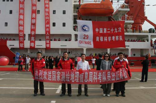 11月5日上午10时整,国家海洋局、广州市人民政府在南沙区汽车码头为中国第29次南极科学考察队举行隆重的欢送仪式。