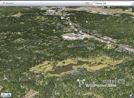 例如,在乔治亚州的亚特兰大城市,苹果将 “Flyover” 模式能显示的范围大面积扩大,使该城市更多的地区可在 “Flyover” 3D模式下浏览。据估算,添加“Flyover” 支持的面积幅度多达200%。其他支持 “Flyover” 模式的城市也获得了改善。