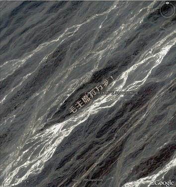 文革时的改天换地的热情已经消退,但人类的狂热仍在地球表面留下了痕迹。在谷歌地球上仔细搜索,仍可找到当时人们劈山破土的遗留痕迹。在谷歌地球搜索框输入“42 39'18.85” N 94 10'00.80“ E”,点击“搜索”,就可以直接定位,我们可以看到在山峦起伏之间,“毛主席万万岁”的字迹。