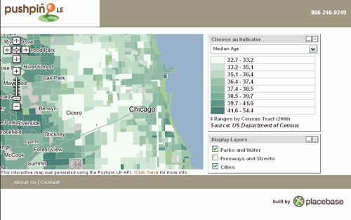 Placebase开发的地图软件功能和Google Maps类似,都可在全球地图上随意放大缩小,并附加各种不同功能的信息层。PushiPin则是该系统的商品化API,已提供给数家企业开发基于该API的地理信息软件服务。