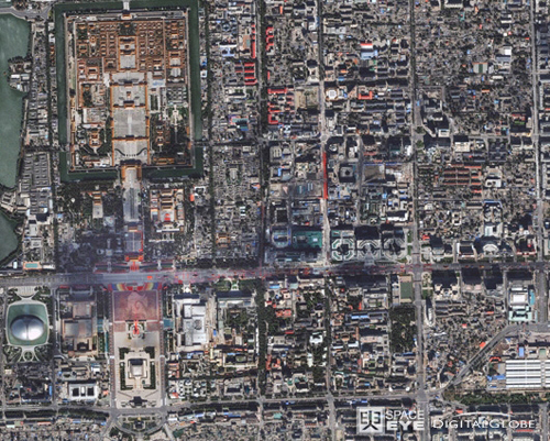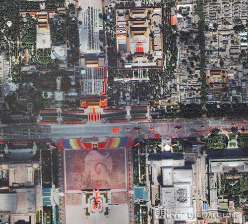 据悉,美国Digital Globe公司近日公布了中国十一国庆60周年庆典的卫星图像,该图像由Quick Bird(快鸟)卫星提供,拍摄日期为2009年10月1日,分辨率为0.6米(2英尺)高分辨率。