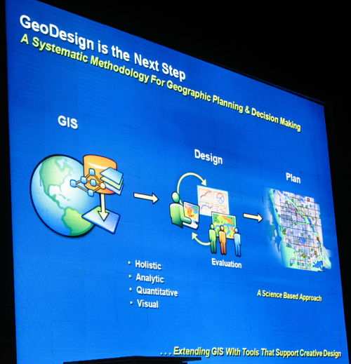ESRI公司总裁Jack Dangermond 亲临会场并做大会主题报告--GIS:Design Our Future。报告中,Dangermond先生详细阐述了今年用户大会的主题,他指出地理是研究我们所在世界的一门科学;而设计是人们为了达到特定目的所从事的创造性活动。GIS将地理和设计这两个截然不同的世界结合起来,形成一个新的领域--地理设计(GeoDesign)。地理设计是关于地理规划和决策制定的系统方法学,它涉及信息的分层及管理、空间量测、分析模型等GIS所有的知识和方法。在此过程中,我们进行设计并及时得到反馈,事实上,这是我们大脑时机的工作方式。但是,此前GIS从未真正做到这一点。我们所要做的就是对GIS进行创新与扩展,使其可为我们提供更加有效的方法和工具,以支持我们创造性的设计过程,并让这种设计良性地影响我们的未来。他还向与会者讲述了GIS是改变世界沟通的方式;明年即将推出的ArcGIS 9.4的全新改进以及GIS的未来。