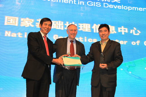 当天,ESRI公司总裁Jack Dangermond 还亲自向中国科学院地理科学与资源研究所颁发了GIS发展特殊贡献奖,向国家基础地理信息中心和环境保护部环境监察局颁发了GIS特别成就奖。