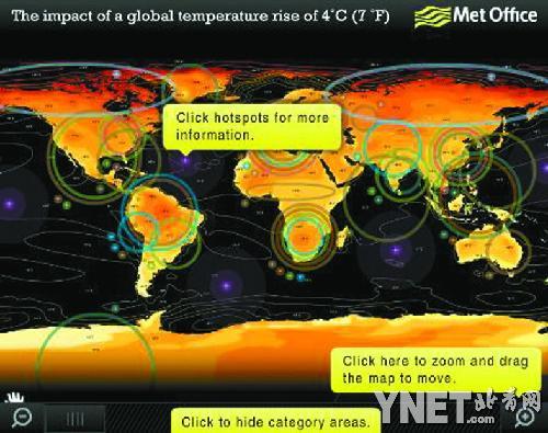 英国气象局最新发表的报告指出,如果不采取有力的减排措施,本世纪末全球平均温度将上升4℃。根据气象模型预测的结果,英国气象局哈德利中心的科学家制作了这份地图,展示全球平均温度比工业革命前高4℃可能给全球带来的影响,包括冰川融化、海平面上升等。