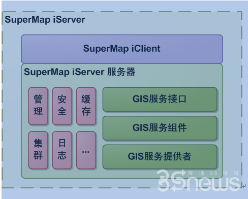 SuperMap iServer 采用了面向服务的体系架构,主要包括 SuperMap iServer 服务器和 SuperMap iClient(SuperMap Web 客户端)两个部分。