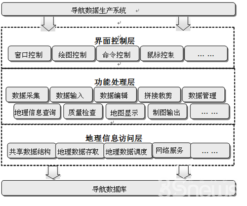 导航数据生产系统内部采取层次化的体系结构,保证不同版本的导航数据生产系统在核心的功能与实现上保持一致,其中包括界面控制层、功能处理层和地理信息访问层三个层次: