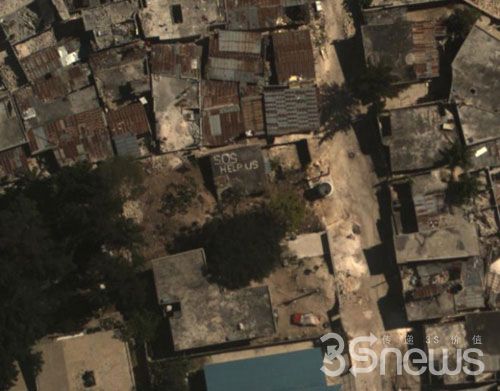 太子港高分辨率航空照片,可看到一个屋顶,写着“呼吁帮助”的大字