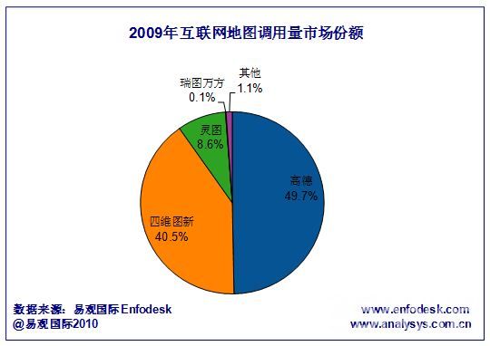 在高德和四维图新这两家互联网地图数据提供商为主导的市场竞争中,高德和四维图新分别通过谷歌地图及Mapbar等下游合作伙伴获得了很大的调用量。其中高德在垂直应用服务商领域(特别是房地产行业)的调用量更为领先,而四维图新的地图在公众应用服务商环节的表现相对突出。
