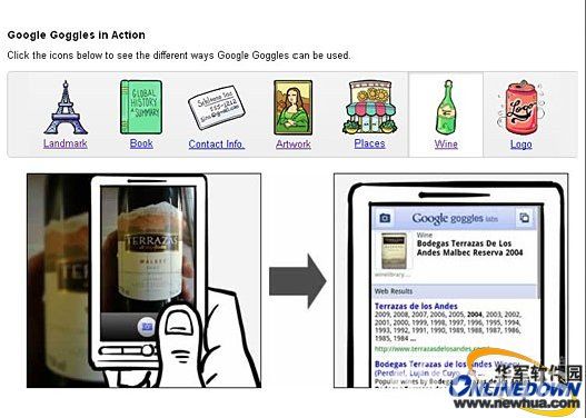 Google Goggles是一款Android平台软件,Android手机用户登录软件商店即可下载。在该软件中,用手机摄像头拍摄当地地标建筑、书籍封面、艺术 作品、酒类标签以及产品商标,即可立即获得相关信息。