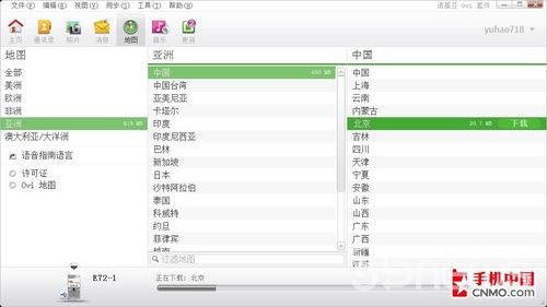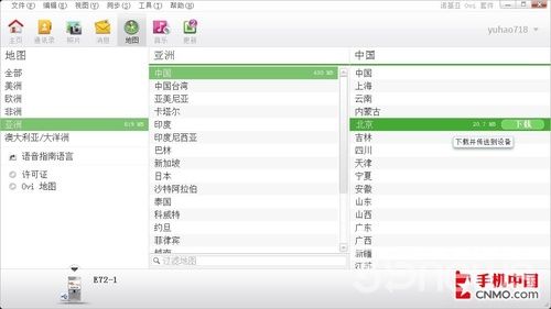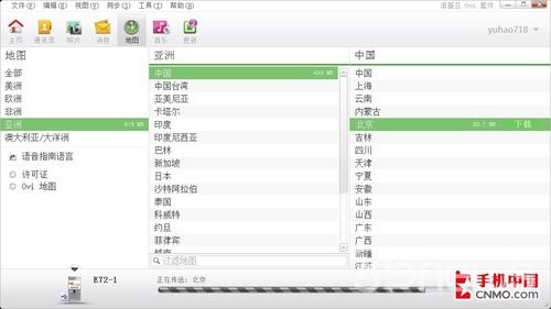 首先要网友需要下载安装诺基亚官方Ovi同步套件,并把手机连接到PC机上(详细教程),连接成功后点选地图按钮。此时如果你手机里安装的并非最新的Ovi Map 3.0,Ovi套件就会出现“地图已更新”的提示,并敦促你“下载更新的地图”,我们点击此按钮。