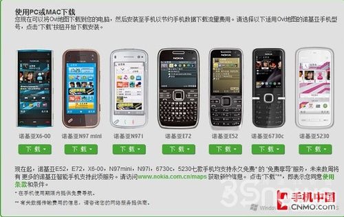 ▲ 诺基亚官方支持免费Ovi地图的众多机型