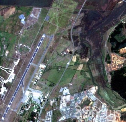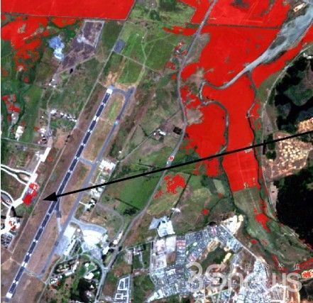 该影像反映了震后康赛普西翁市机场附近区域的变化,箭头指示地方为机场建筑
